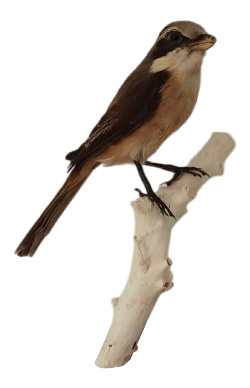 红尾伯劳是雀形目伯劳科伯劳属鸟类。红尾伯劳体型略小,雄鸟头顶和枕部为灰色,有宽阔的黑色贯眼纹;背部、两翼和尾羽为棕褐色。喉部为白色,胸腹部和腹部为皮黄色;雌鸟外观似雄鸟,但头部灰褐色,两胁有褐色鱼鳞纹;幼鸟外观似雌鸟,但头顶为棕色。红尾伯劳分布于亚洲东部,在中国广泛分布于多地,低山丘陵和山脚平原地带的灌丛、疏林和林缘地带,尤其在有低矮树木和灌丛生长的开阔旷野、河谷、湖畔、路旁和田边地头灌丛中较常见,也栖息于草甸灌丛、山地阔叶林和针阔叶混交林林缘灌丛及其附近的小块次生林内。红尾伯劳标本在生物学和动物学教育中具有重要作用,可以帮助学生更直观地了解这一物种的形态特征和生物学知识。一个高质量的红尾伯劳标本应准确再现其整体形态、羽毛颜色和特征。通过精心选择材料和制作工艺,可以制作出既具有教育意义又具有装饰和收藏价值的红尾伯劳标本。