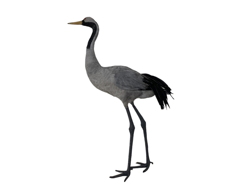 灰鹤是鹤形目鹤科鹤属鸟类,别名千岁鹤、玄鹤、番薯鹤、普通鹤、元鹤。灰鹤分布于欧亚大陆、北美洲和非洲北部地区。在中国见于东北、华北、西北、华中、西南和东南沿海。栖息于开阔的草地、湖泊、河滩及沼泽地带。仿真灰鹤标本在生物学教育中具有重要作用,可以帮助学生更直观地了解灰鹤的形态特征和生物学知识。由于其高度的逼真度和美观性,仿真灰鹤标本也常被用于装饰和收藏。它能够为家居或展览空间增添一份自然野性的美感,同时也具有收藏价值。特别是对于热爱自然和野生动物的收藏家来说,这样的标本具有很高的吸引力。一个高质量的仿真灰鹤标本应准确再现灰鹤的整体形态、羽毛颜色、局部细节以及特征性的头部标记。通过精心选择材料和制作工艺,可以制作出既具有教育意义又具有装饰和收藏价值的仿真标本。