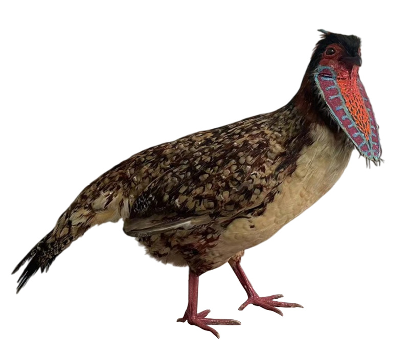 黄腹角雉仅分布于中国浙江、江西、湖南、福建到两广一带。栖息于亚热带中低山地的常绿阔叶林和针阔叶混交林中,常在林下灌丛中活动。制作仿真黄腹角雉标本需要精细雕刻和塑形,以准确还原黄腹角雉的身体比例和形态特征。羽毛的排列、颜色和光泽度应与真实黄腹角雉相符,特别是雄性成鸟那些复杂的羽毛图案。作为生物教学或科普展览的道具,帮助学生和公众更好地了解黄腹角雉的形态特征和生物学知识。一个高质量的仿真黄腹角雉标本应准确再现黄腹角雉的整体形态、羽毛颜色和特征、局部细节以及求偶时的特殊形态。通过精心选择材料和制作工艺,可以制作出既具有教育意义又具有装饰和收藏价值的仿真标本。