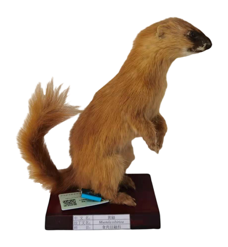 黄鼬标本,它通常指的是经过特殊处理和保存的黄鼬的实体,用于科学研究、教育展示或收藏。标本制作的过程通常包括清理、整形、防腐处理和保存等步骤,以确保其形态、特征和颜色的长期保存。黄鼬标本在科学研究中具有重要意义,可以帮助人们了解黄鼬的生物学特征、生态习性以及其在生态系统中的作用。